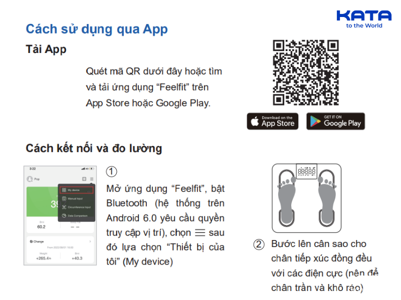 Toàn bộ 13 chỉ số sức khỏe cân sức khỏe điện tử KATA CS10E đo được đều được tổng hợp trên ứng dụng Feelfit. Người dùng cần thực hiện kết nối cân điện tử với điện thoại thông minh có cài đặt ứng dụng theo các hướng dẫn sau: