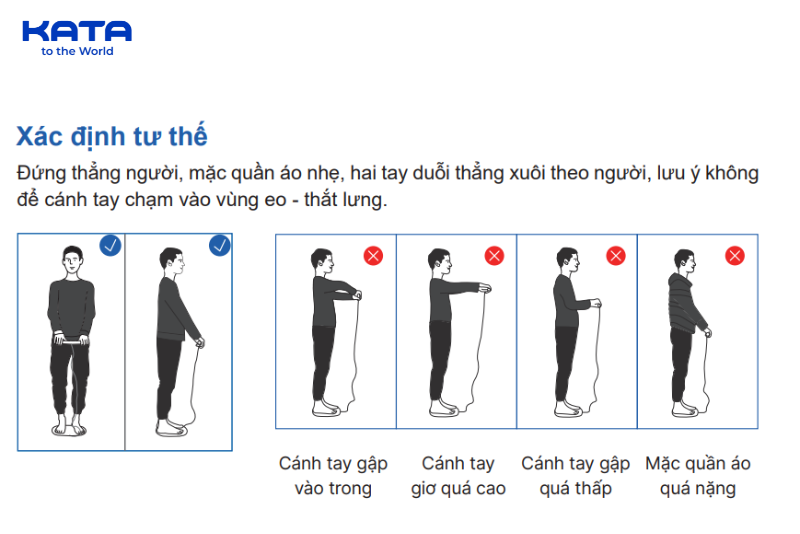 Đứng thẳng người, mặc quần áo có trọng lượng nhẹ. Hai tay duỗi thẳng xuôi theo thân người, tránh để cánh tay chạm vào các vùng eo - thắt lưng. Trong quá trình cân, bạn cần giữ nguyên tư thế và tránh di chuyển để không bị gián đoạn quá trình đo.