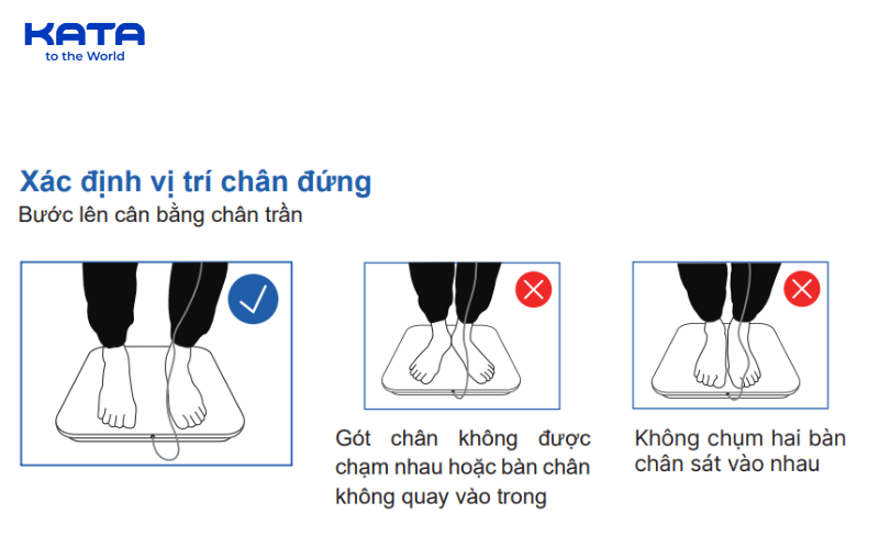 Bạn nên tháo bỏ giày dép và tất, để dòng điện từ cân có thể tiếp xúc trực tiếp với bàn chân đem đến độ chính xác cao hơn. Trên bàn cân, các gót chân không được chạm nhau hoặc bàn chân không quay vào trong, hai bàn chân không nên chụm sát mà phân bố theo 4 điểm tiếp xúc điện cực của KATA CS10E.