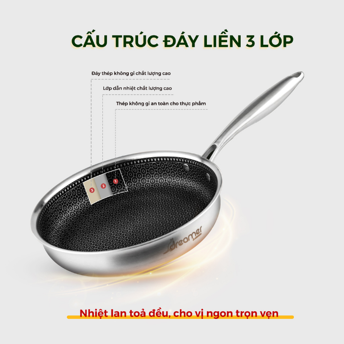 Sản phẩm được thiết kế dày 2.5mm với cấu trúc tối ưu bao gồm lõi nhôm truyền nhiệt nằm giữa 2 lớp thép không gỉ giúp nhiệt lan toả đều, tiêu thụ lượng dầu mỡ ít hơn trong quá trình nấu ăn, bảo vệ sức khỏe người dùng.