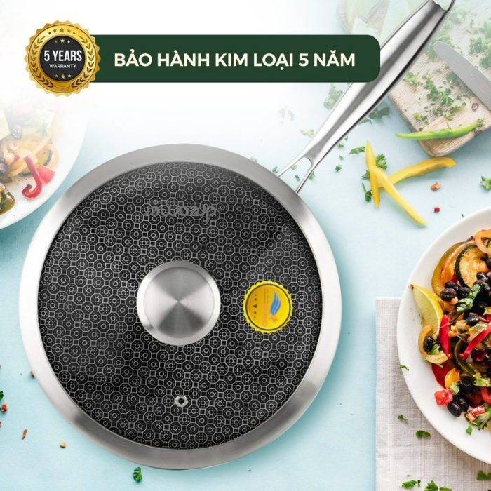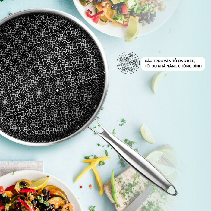 - Thiết kế vân tổ ong kép trên bề mặt chảo nâng cao khả năng chống dính.