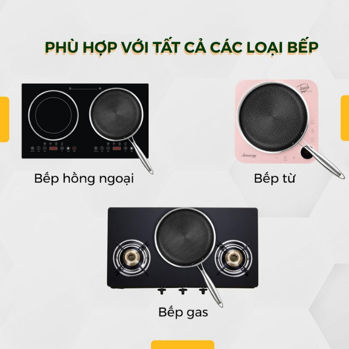 - Chảo chống dính Dreamer tương thích với bếp từ , bếp gas, bếp hồng ngoại.