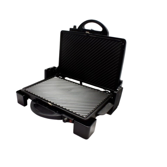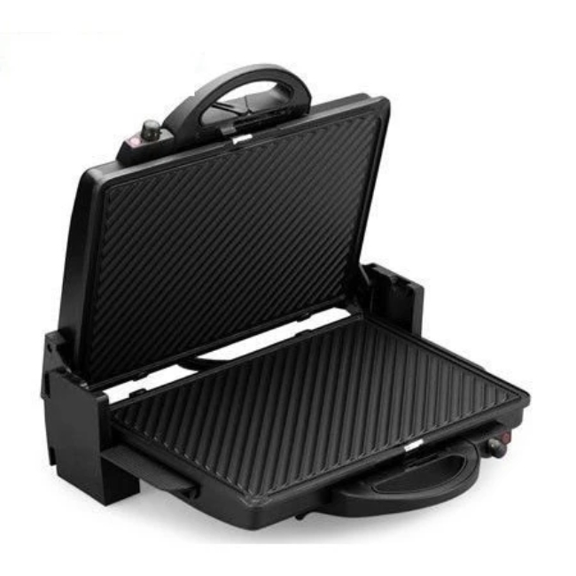 _ Các mặt nướng của máy được phủ lớp chống dính cao cấp, giúp thực phẩm không bị dính vào bề mặt và việc vệ sinh sau khi sử dụng trở nên cực kỳ dễ dàng. Bạn có thể dễ dàng điều chỉnh nhiệt độ nướng thông qua núm xoay, linh hoạt cài đặt mức nhiệt phù hợp với từng loại thực phẩm, đảm bảo món ăn luôn đạt được độ chín và hương vị tối ưu. Đèn báo nguồn và đèn báo sẵn sàng giúp bạn dễ dàng theo dõi trạng thái hoạt động của máy.