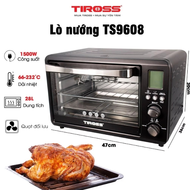 Một điểm cộng lớn của chiếc lò này là cửa kính chịu nhiệt trong suốt, cho phép bạn dễ dàng quan sát quá trình nướng bên trong mà không cần mở cửa, tránh làm thất thoát nhiệt. Đặc biệt, lò được thiết kế với khay đựng đồ thừa có thể tháo rời, giúp việc vệ sinh sau mỗi lần sử dụng trở nên cực kỳ đơn giản và nhanh chóng, giữ cho lò luôn sạch sẽ và hợp vệ sinh. Lò nướng điện TIROSS TS9608 đi kèm với đầy đủ các phụ kiện cơ bản như khay nướng, vỉ nướng, tay cầm khay và có thể có xiên quay, sẵn sàng cho mọi nhu cầu sử dụng của bạn. Với thiết kế nhỏ gọn, hiện đại và tính năng tiện ích, đây sẽ là một trợ thủ đắc lực trong căn bếp của mọi gia đình.
