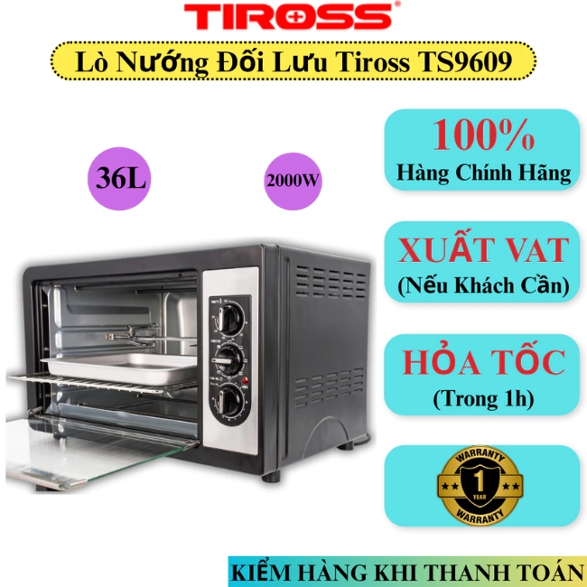 Lò nướng điện 36L TIROSS 2000W - TS9609 là một thiết bị gia dụng cao cấp, được thiết kế để đáp ứng nhu cầu nấu nướng chuyên nghiệp ngay tại căn bếp gia đình bạn. Với dung tích 36 lít rộng rãi, lò cho phép bạn dễ dàng nướng các món ăn lớn như gà, vịt nguyên con, hoặc cùng lúc nhiều loại bánh, món ăn khác nhau, rất lý tưởng cho các buổi tiệc hoặc gia đình đông thành viên.