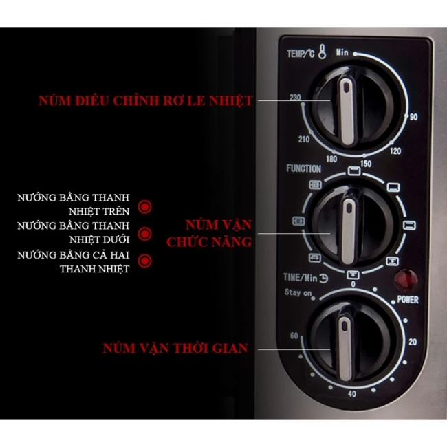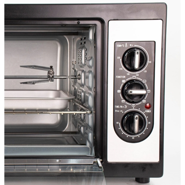 Bạn có thể dễ dàng điều chỉnh nhiệt độ từ 100°C đến 250°C và cài đặt thời gian nấu với bộ hẹn giờ cơ học lên đến 60 hoặc 120 phút. Lò sẽ tự động ngắt và có chuông báo khi kết thúc. Cửa lò làm bằng kính cường lực chịu nhiệt, trong suốt, giúp bạn dễ dàng quan sát quá trình nướng mà không cần mở cửa. Đèn chiếu sáng bên trong cũng hỗ trợ quan sát rõ ràng hơn.