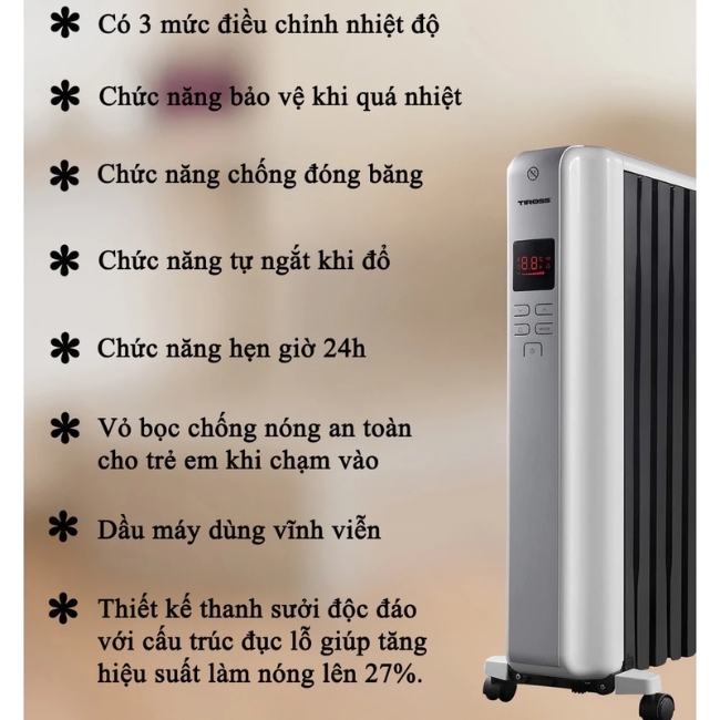 Lò sưởi dầu 12 thanh TIROSS TS9218 là một thiết bị sưởi ấm mạnh mẽ và đáng tin cậy, được thiết kế để mang lại sự ấm áp hiệu quả và bền bỉ cho các không gian rộng như phòng khách, phòng ngủ lớn hoặc văn phòng. Với 12 thanh sưởi, TS9218 tối ưu hóa diện tích tiếp xúc và khả năng tản nhiệt, đảm bảo hơi ấm lan tỏa nhanh chóng và đều khắp mọi ngóc ngách của căn phòng, ngay cả trong điều kiện thời tiết lạnh giá.