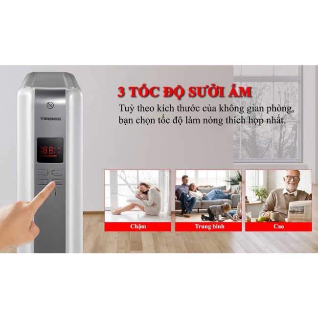 TIROSS TS9218 cung cấp nhiều mức công suất sưởi mạnh mẽ (thường lên đến 2500W-2800W), cho phép người dùng linh hoạt lựa chọn cường độ làm ấm phù hợp với nhiệt độ môi trường và diện tích phòng. Là một mẫu hiện đại, TS9218 thường được trang bị bảng điều khiển điện tử thân thiện với màn hình LED rõ ràng cùng điều khiển từ xa, giúp bạn dễ dàng điều chỉnh nhiệt độ, cài đặt các mức công suất và đặc biệt là chức năng hẹn giờ lên tới 24 giờ mà không cần lại gần thiết bị. Bộ điều nhiệt (thermostat) tự động sẽ duy trì nhiệt độ phòng ổn định theo cài đặt, tự động bật/tắt để tối ưu hóa việc sử dụng điện năng.