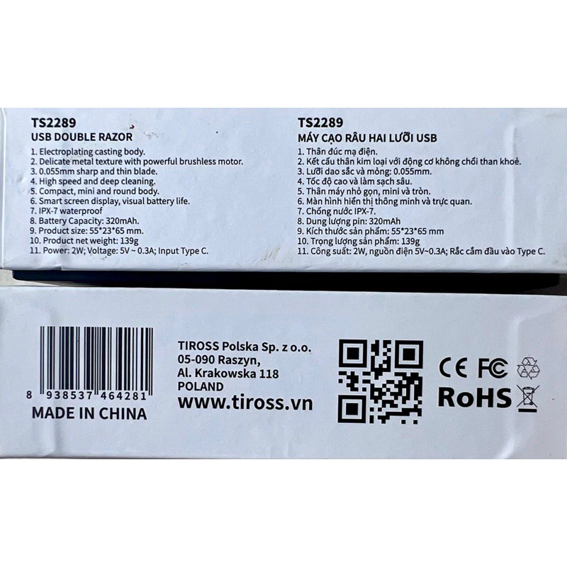 Tiện ích và công nghệ thông minh: Một trong những điểm nhấn của TS2289 là khả năng chống nước toàn thân đạt chuẩn IPX7. Điều này cho phép người dùng có thể linh hoạt sử dụng máy để cạo khô hoặc cạo ướt với bọt cạo râu, đồng thời việc vệ sinh máy dưới vòi nước trực tiếp cũng trở nên đơn giản và an toàn.