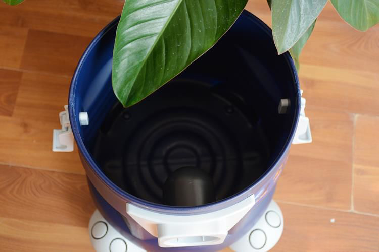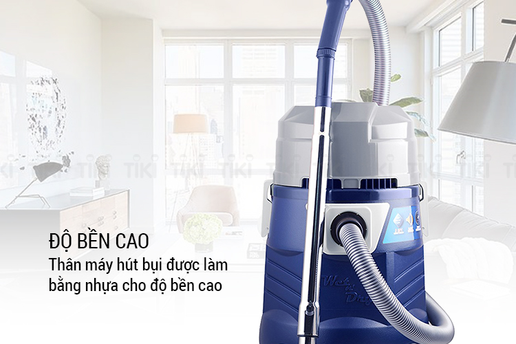 Thân máy hút bụi được làm bằng nhựa cho độ bền cao, phía dưới có thiết kế bánh xe chắc chắn, dễ dàng di chuyển khi sử dụng.
