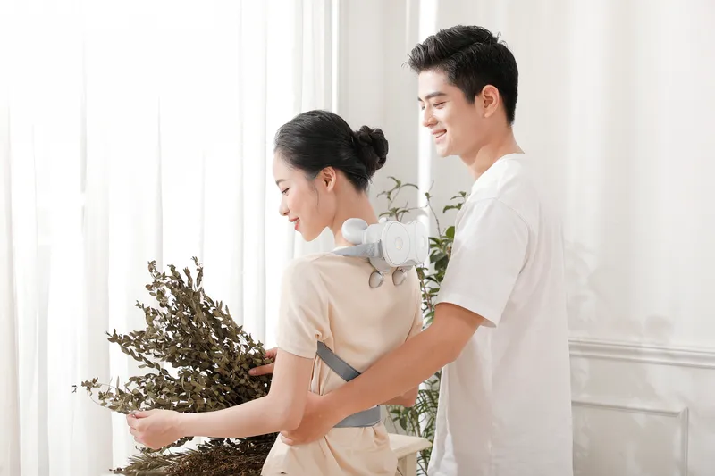 Đeo chéo lưng: Trước hết bạn cần tách dây đai để gia tăng chiều dài. Đặt máy ngay ngắn trên vùng cổ, kéo dây đai vòng qua vai ra đằng trước, sau đó kéo ra sau lưng. Tiếp tục đan chéo hai dây đai ở sau lưng và kéo vòng về đằng trước, dán Velcro lại để cố định. Trong quá trình kéo dây, lưu ý để dây cố định vừa phải, không thắt quá chặt để đảm bảo máy ôm thoải mái, tránh áp lực lên vùng cổ.