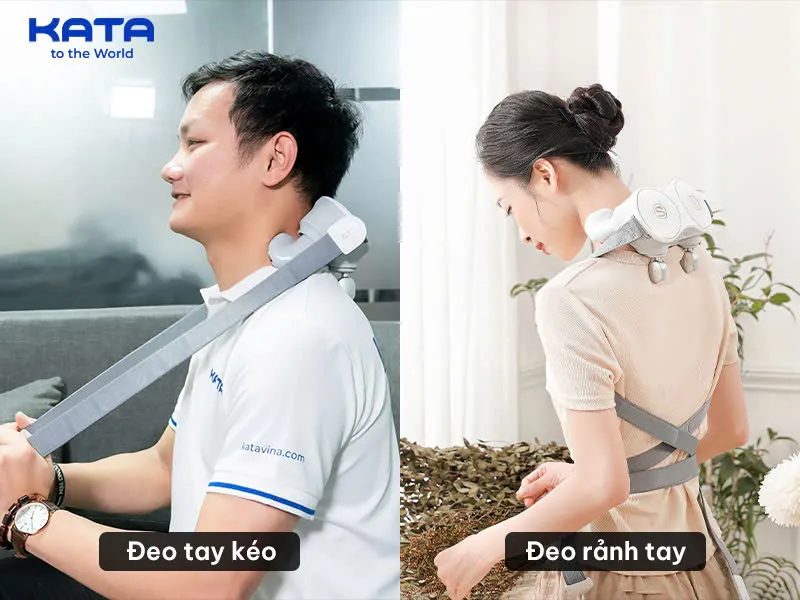 Đeo tay kéo: Đặt máy lên cổ sao cho các đầu massage tiếp xúc trực tiếp và cân đối với vùng cổ, sau đó kéo dây đai xuống bằng 2 tay.