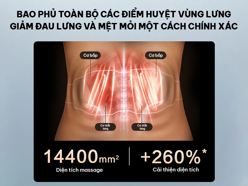 Nhờ ưu biệt về số lượng đầu massage, diện tích massage của SKG W9 PRO cũng xếp hàng “top” khi tăng khoảng 260% lên 14400mm2 thay vì chỉ có 4000mm2 của các sản phẩm thông thường. Máy massage lưng SKG W9 PRO nhờ vậy sẽ dễ dàng bao phủ toàn bộ hệ thống các huyệt đạo chính trên lưng nhằm tác động vào các kinh mạch đau nhức đem lại cảm giác êm dịu khi bạn sử dụng.