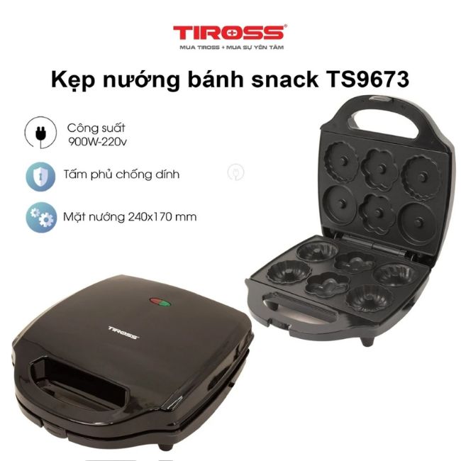 _ Máy nướng bánh Snack (hình thú) TIROSS - TS9672 là một thiết bị gia dụng độc đáo và vô cùng đáng yêu, giúp bạn dễ dàng tự tay tạo ra những chiếc bánh snack nhỏ xinh với hình dáng ác con vật ngộ nghĩnh ngay tại nhà. Sản phẩm này đặc biệt lý tưởng để thu hút trẻ nhỏ vào bữa ăn hoặc để chuẩn bị những món ăn nhẹ vui mắt cho các bữa tiệc sinh nhật, họp mặt bạn bè.