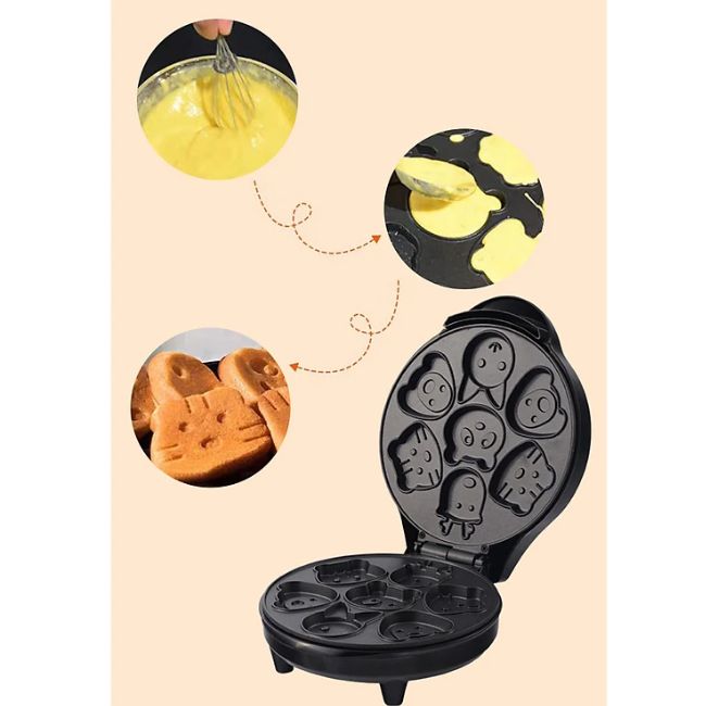 _ Với công suất khoảng 750W, máy làm nóng nhanh chóng và duy trì nhiệt độ ổn định, đảm bảo các mẻ bánh được nướng chín đều, có màu vàng đẹp mắt và thơm ngon. Khuôn nướng được thiết kế chuyên biệt với nhiều hình con vật khác nhau (ví dụ như gấu, thỏ, mèo, lợn...) giúp bạn có thể làm nhiều loại bánh cùng lúc, tạo sự đa dạng và hấp dẫn.