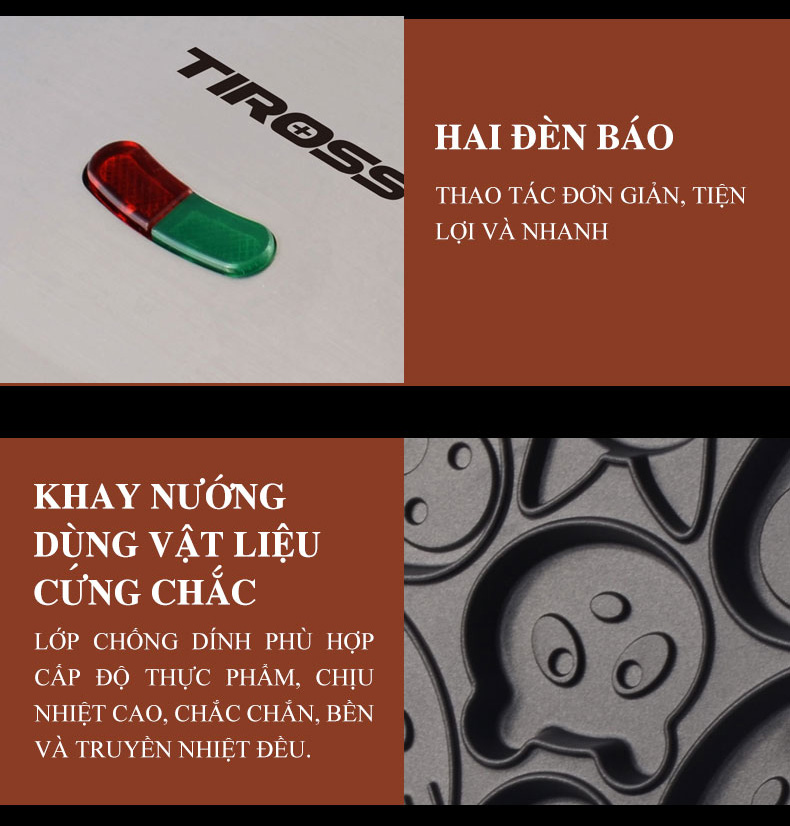 _ Máy nướng bánh Snack (hình thú) TIROSS - TS9672 là một thiết bị gia dụng độc đáo và vô cùng đáng yêu, giúp bạn dễ dàng tự tay tạo ra những chiếc bánh snack nhỏ xinh với hình dáng các con vật ngộ nghĩnh ngay tại nhà. Sản phẩm này đặc biệt lý tưởng để thu hút trẻ nhỏ vào bữa ăn hoặc để chuẩn bị những món ăn nhẹ vui mắt cho các bữa tiệc sinh nhật, họp mặt bạn bè.
