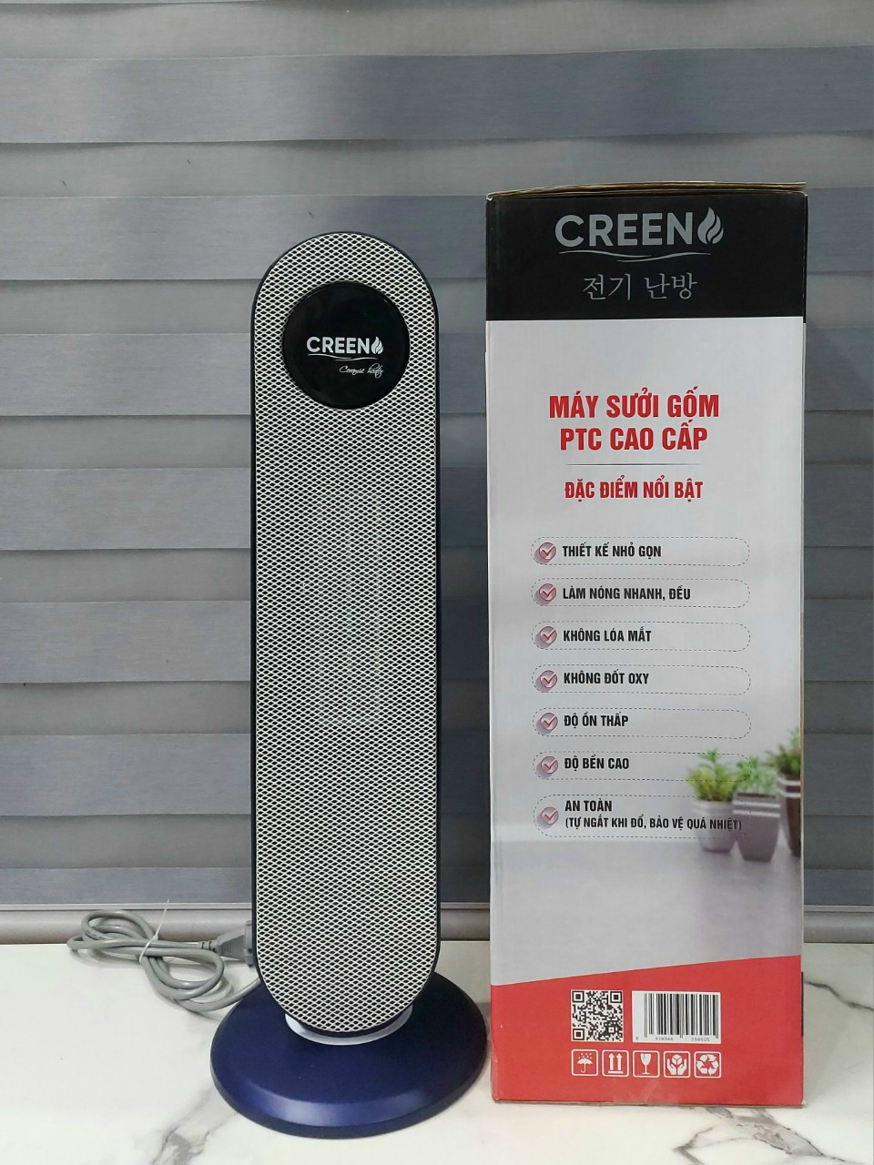 Máy sưởi gốm Creen (Ceramic) hoạt động dựa trên nguyên lý sử dụng điện năng đốt nóng thanh gốm và dùng nguyên lý đối lưu để tỏa nhiệt. Máy sưởi gốm Creen dùng gốm làm vật phát nhiệt, bộ phận này trong máy sưởi gốm là một miếng gốm hình đĩa gọi là đĩa gốm. Đĩa này được nối với một vật bằng kim loại, khi đĩa gốm được làm nóng lên sẽ truyền nhiệt cho dây kim loại và dòng nhiệt lượng đó sẽ được truyền đi theo hình thức đối lưu và mang hơi ấm tỏa ra từ từ ra bên ngoài giúp tăng nhiệt độ phòng mà không gây sốc nhiệt.