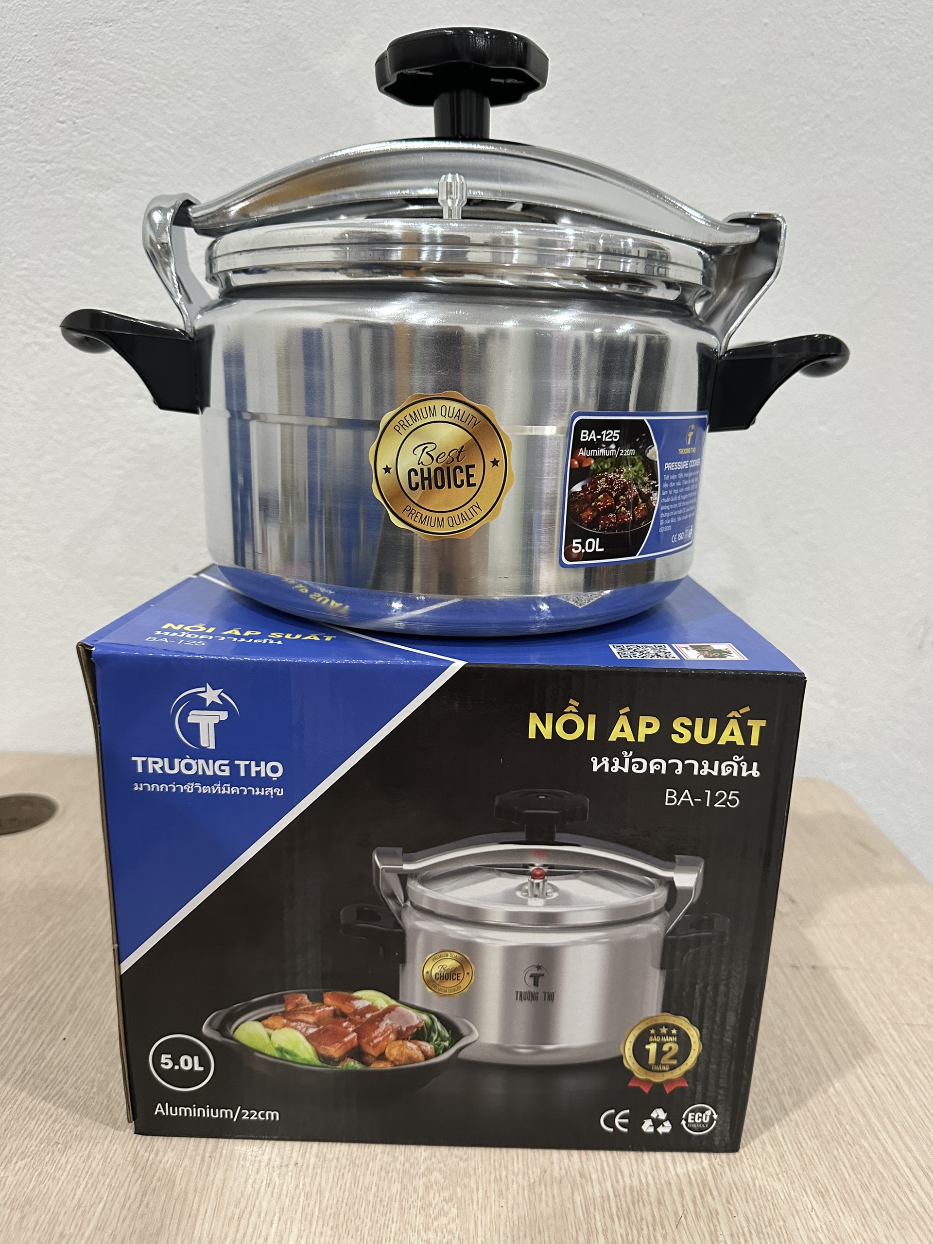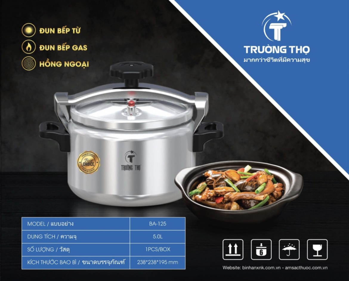 Nồi áp suất Trường Thọ BA-125 được chế tạo từ nhôm nguyên chất, có khả năng truyền nhiệt nhanh và đều, giúp tiết kiệm thời gian nấu nướng. Với thiết kế đáy từ 5 lớp, sản phẩm tương thích với nhiều loại bếp như bếp từ, bếp hồng ngoại và bếp gas. Tay cầm và núm vặn được làm từ nhựa chịu nhiệt, đảm bảo an toàn khi sử dụng