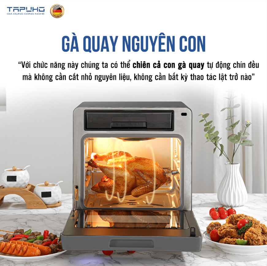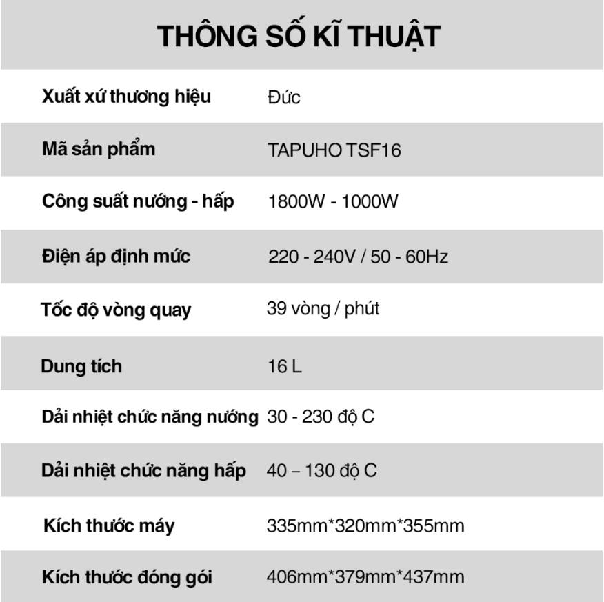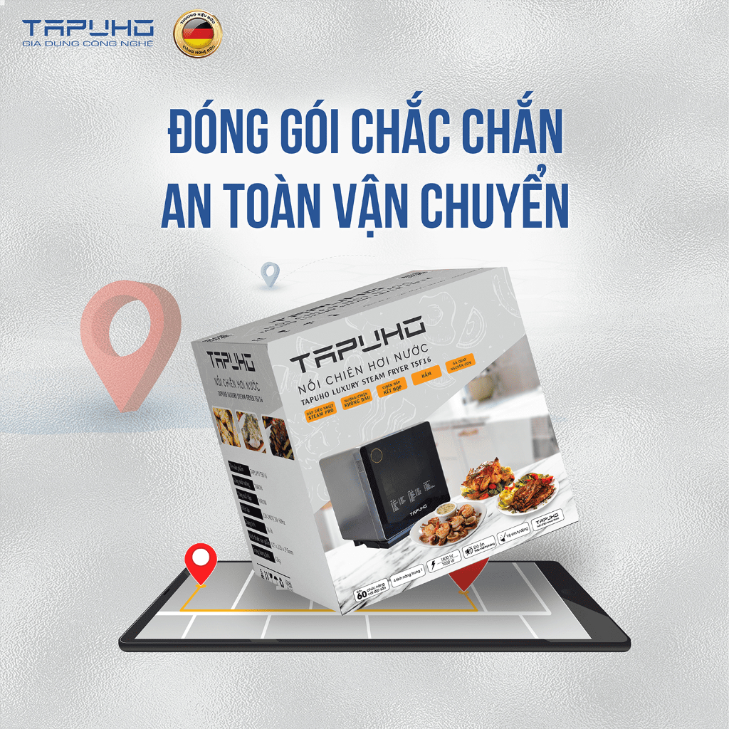 Nồi Chiên Hơi Nước TAPUHO TSF16 là sản phẩm nồi chiên hơi nước mới nhất của TAPUHO - thương hiệu gia dụng cao cấp đến từ Đức. Đây là dòng sản phẩm mang tính đột phá, bùng nổ công nghệ với sự kết hợp giữa nồi chiên không dầu (công nghệ rapid air) và nồi hấp (công nghệ hơi nước siêu nhiệt steam pro) mang đến sự tiện lợi cho khách hàng, ngoài ra nó còn là sự kết hợp 4 tính năng trong 1, đó là tính năng Hấp - Chiên không dầu - Chiên hấp kết hợp - Hầm và đặc biệt có những chức năng chỉ có trên Nồi Chiên Hơi Nước TAPUHO TSF16 mà chưa từng có trên bất kỳ sản phẩm cùng loại nào trên thị trường.