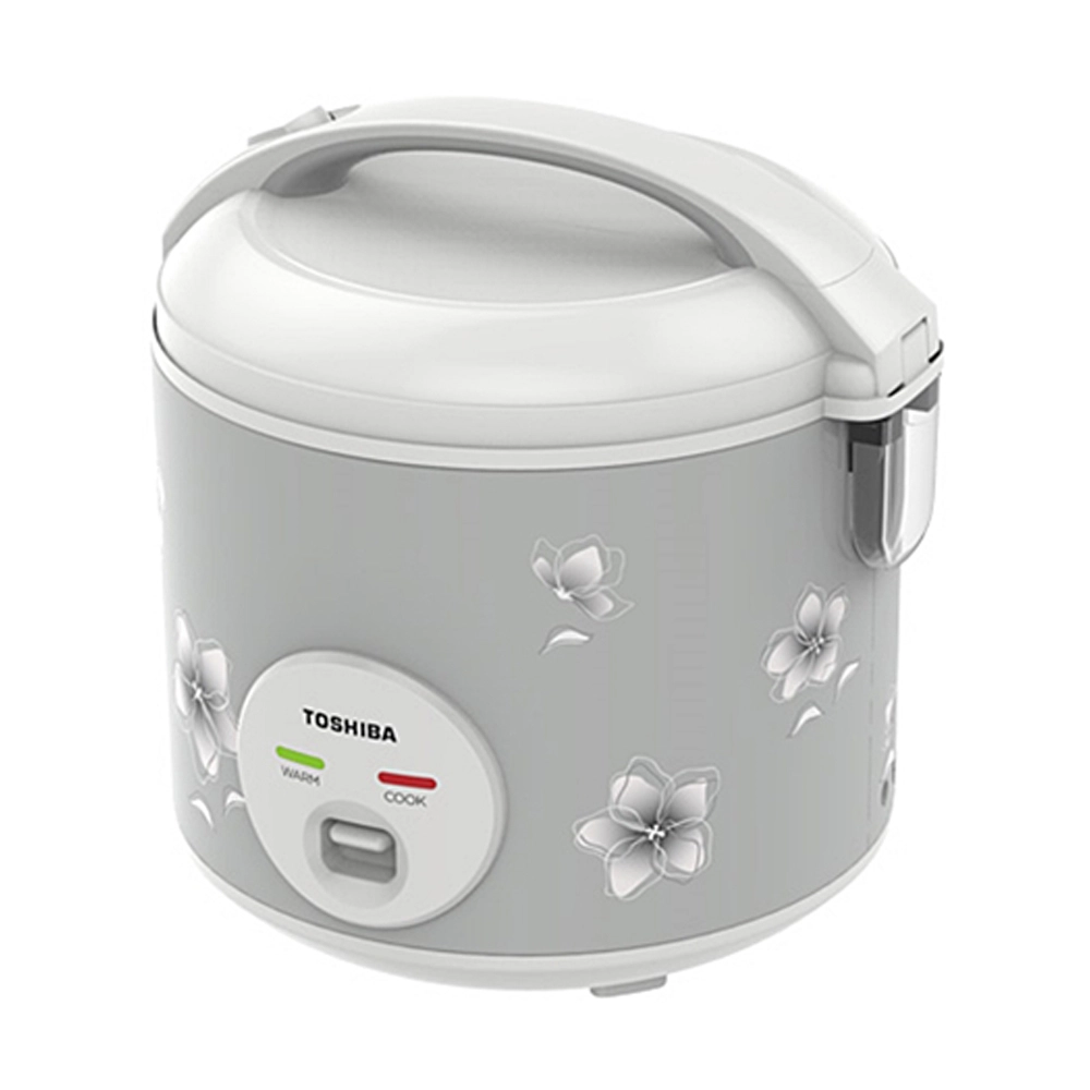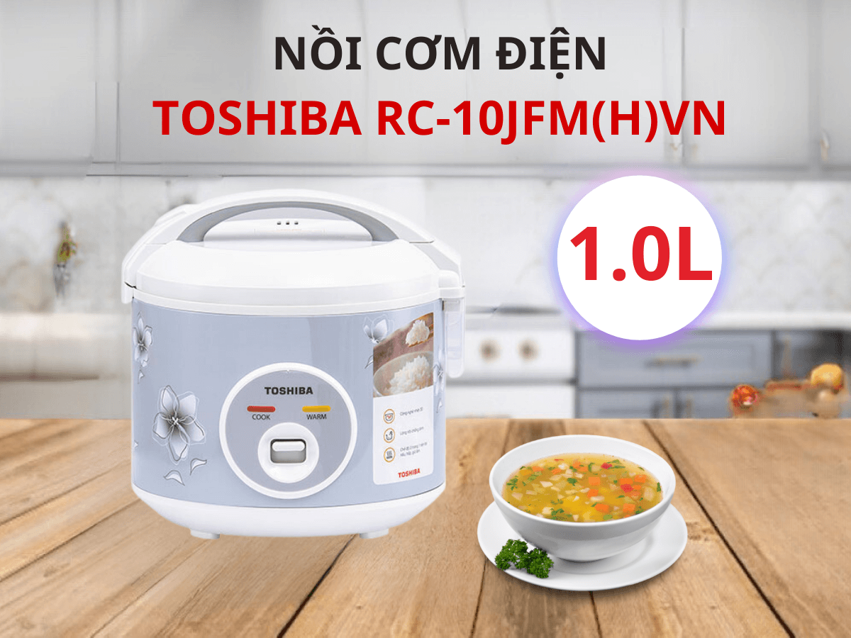 _ Nồi cơm điện Toshiba RC‑10JFM(H)VN là dòng nắp gài mini dung tích 1 lít, thiết kế tinh tế với màu sắc xám – trắng, phù hợp cho gia đình 2–4 người. Vỏ ngoài sử dụng thép phủ sơn tĩnh điện, nổi bật với hoa văn nhẹ nhàng, mang lại vẻ hiện đại và dễ dàng vệ sinh. Lòng nồi bằng hợp kim nhôm/chống dính hai lớp dày 1,7 mm, giúp cơm không bám dính, dễ chùi rửa.