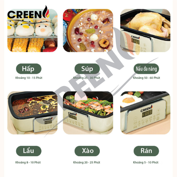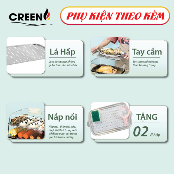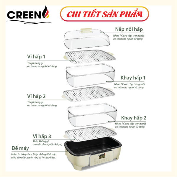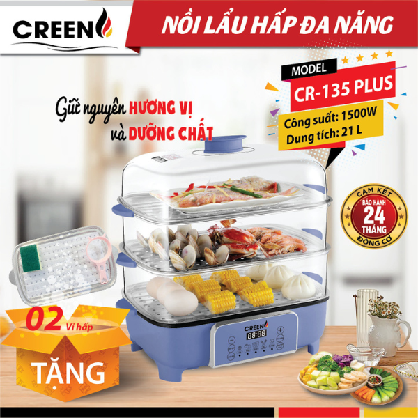Nồi lẩu đa năng Creen CR-135 Plus là thiết bị nhà bếp đa năng, kết hợp giữa chức năng nấu lẩu và hấp thực phẩm với thiết kế 3 tầng tiện lợi, giúp bạn dễ dàng chế biến đa dạng món ăn cho gia đình. Với công suất 1500W, nồi làm nóng nhanh chóng, tiết kiệm thời gian nấu nướng. Lòng nồi phủ chống dính cao cấp, các tầng hấp bằng thép không gỉ an toàn cho sức khỏe, nắp nồi bằng nhựa chịu nhiệt trong suốt giúp dễ dàng quan sát quá trình nấu.