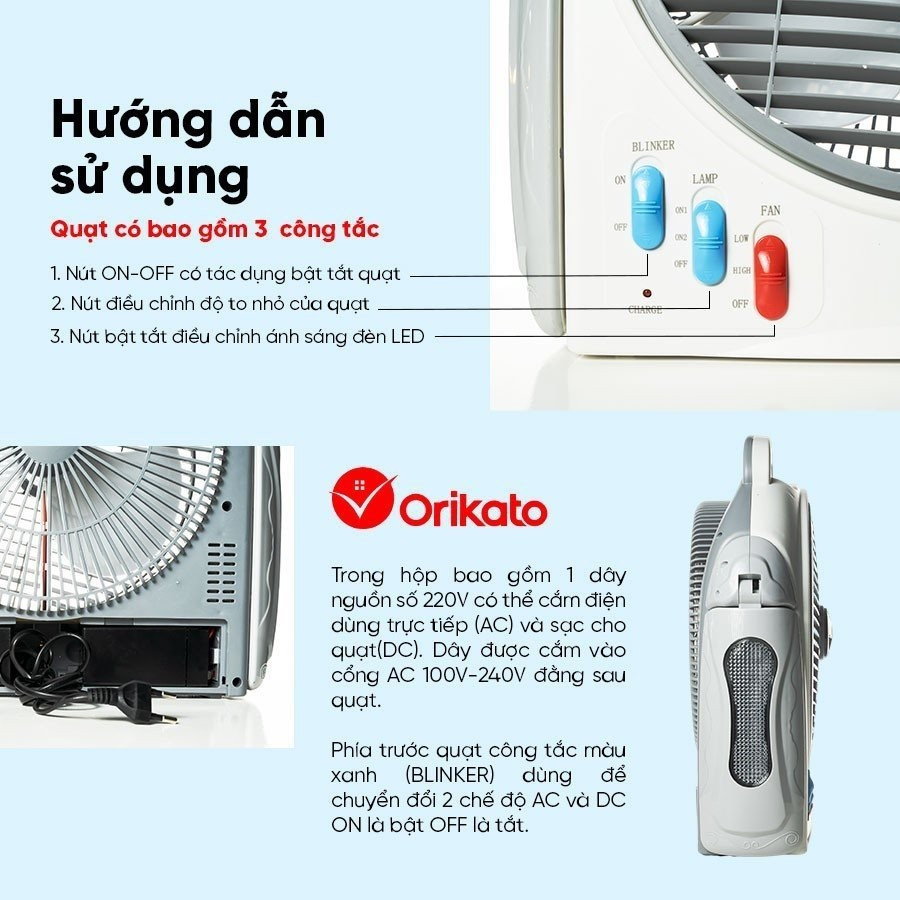 _ Quá trình sạc mất khoảng 15–18 giờ, sau đó quạt có thể hoạt động liên tục trên 8 giờ ở chế độ cao hoặc hơn 12 giờ ở chế độ thấp. Đèn LED cũng có thời gian bật dài: hơn 20 giờ (sáng cao) và hơn 48 giờ (sáng thấp). Điện sạc định mức khoảng 850 mA. Sản phẩm còn tích hợp đèn báo trạng thái pin (đỏ khi sạc, xanh khi đầy). Đây là thiết bị lý tưởng cho các gia đình cần giải pháp chiếu sáng và làm mát khi mất điện, đặc biệt hữu ích ở vùng nông thôn hoặc tại khu vực hay cắt điện.