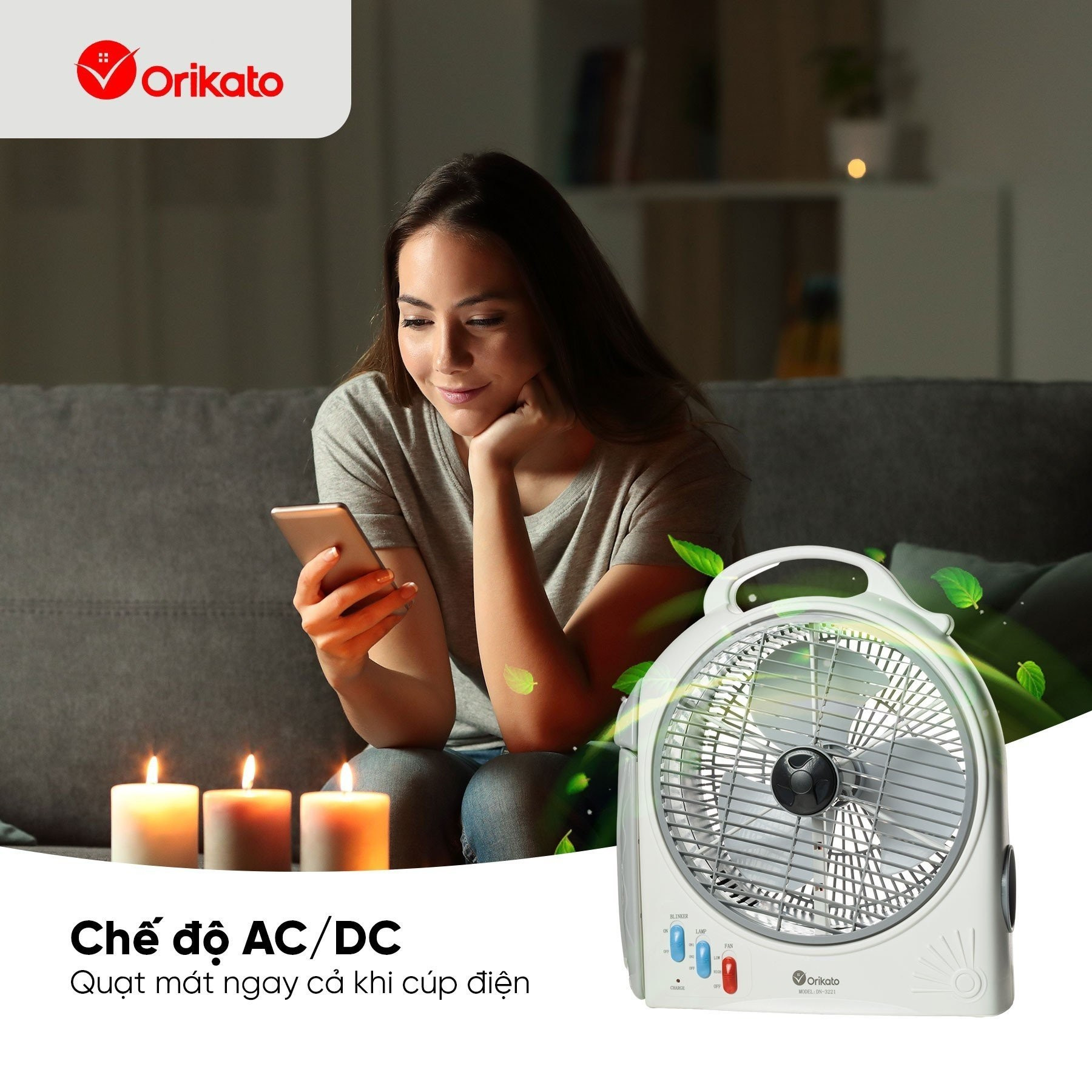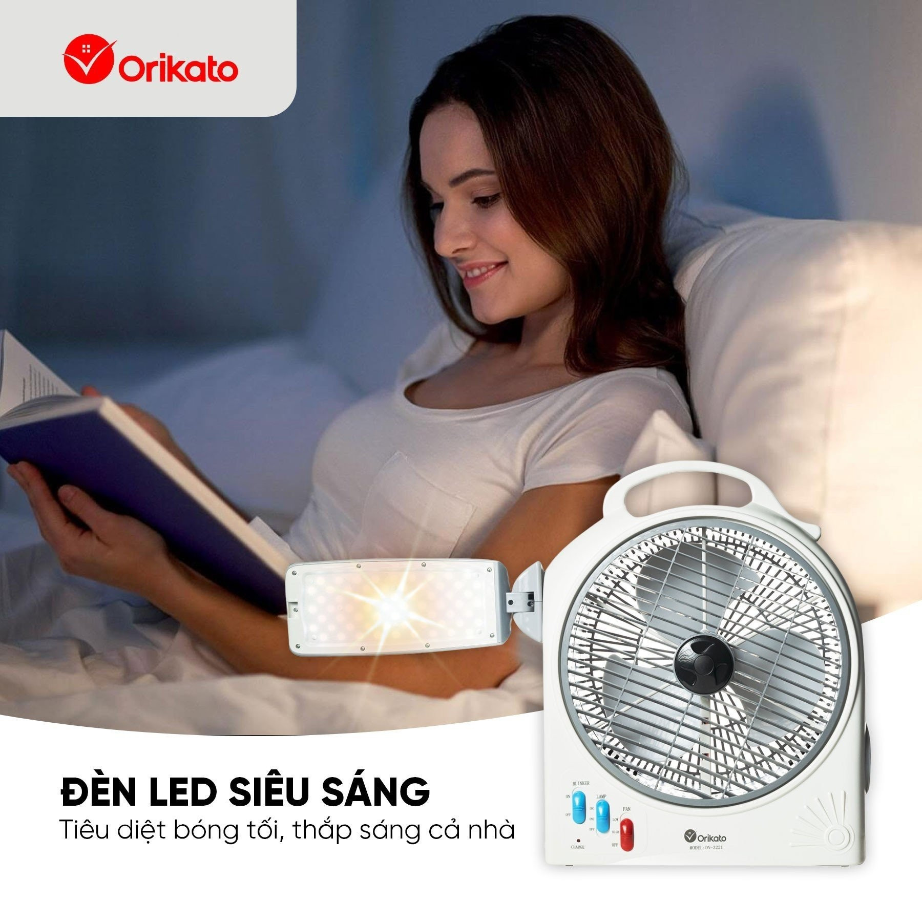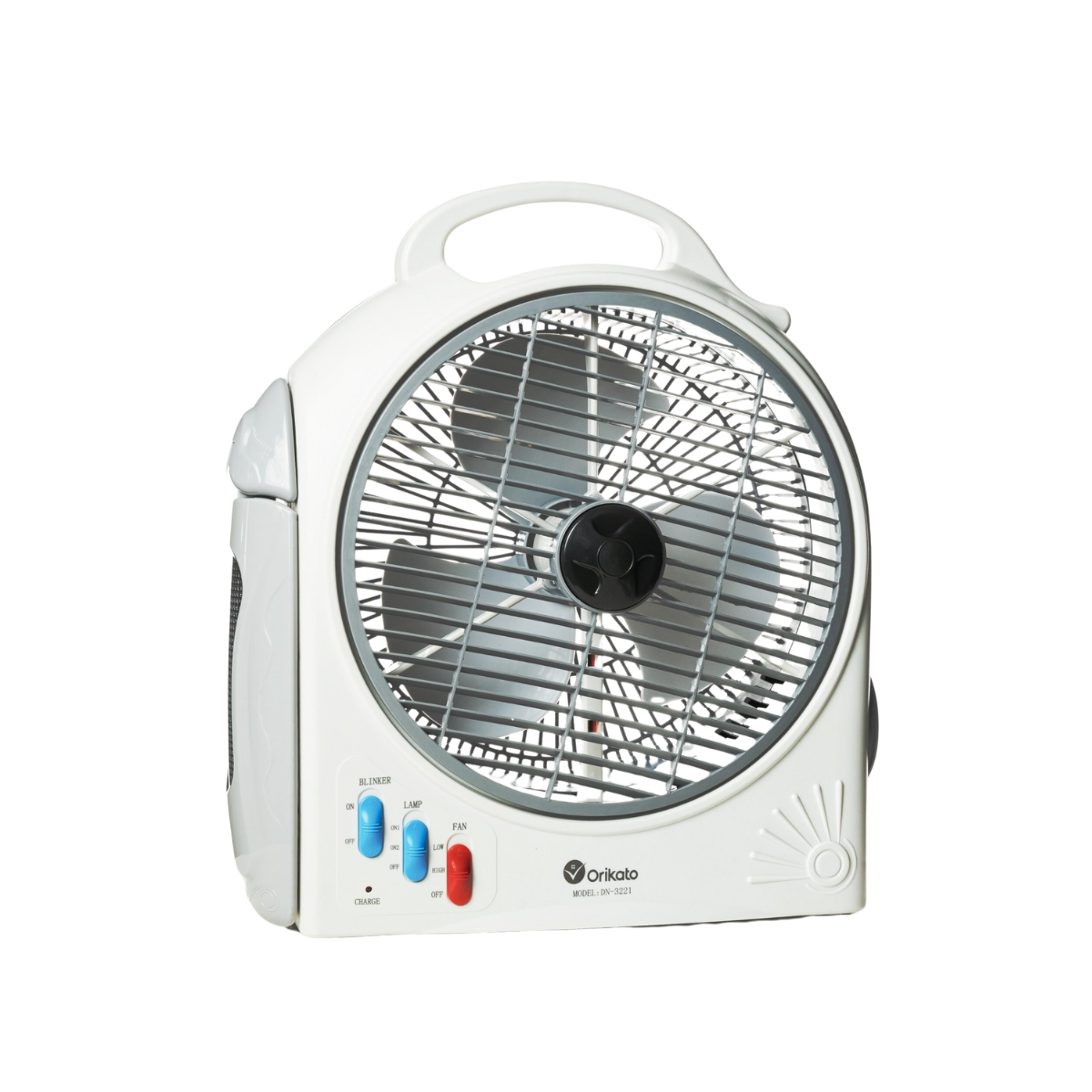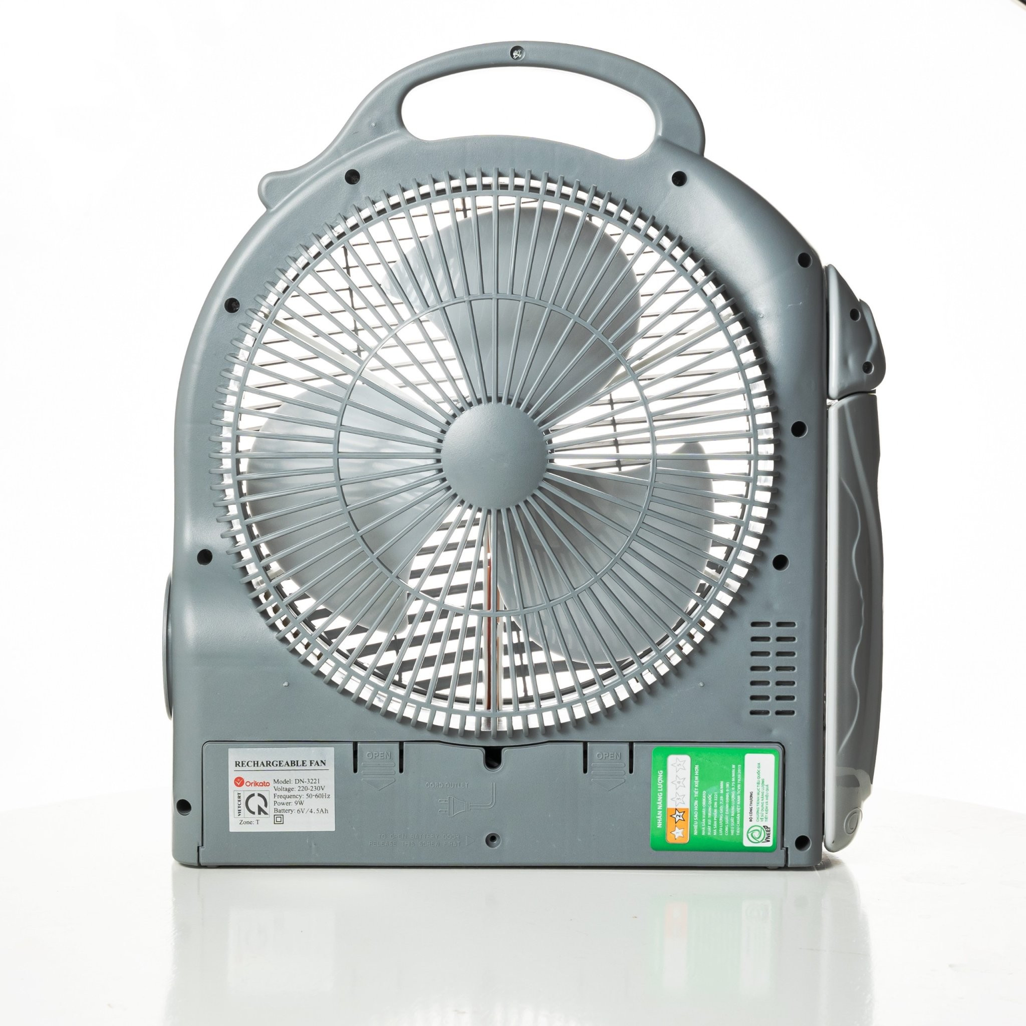 _ Tên sản phẩm là Quạt năng lượng kiêm đèn sạc ORIKATO DN‑3221 được thiết kế nhỏ gọn theo dạng hộp vuông, kích thước 31,5×13,5×36,5 cm và trọng lượng nhẹ chỉ khoảng 3 kg. Sản phẩm có phần thân làm bằng nhựa ABS cao cấp, vừa bền, vừa chịu được va đập, đồng thời tạo nên vẻ ngoài trang nhã màu trắng xám.